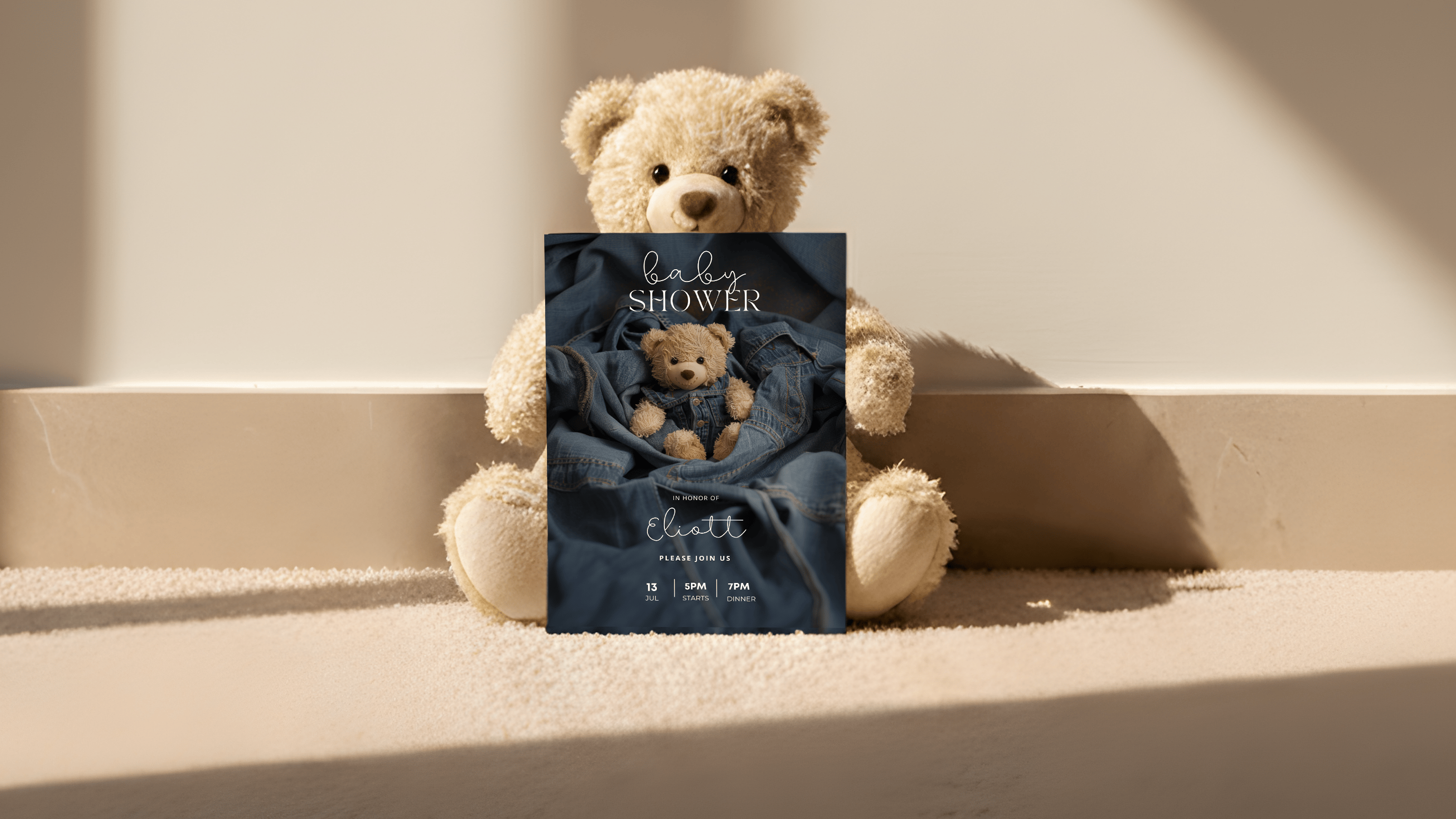 Denim Teddy Bear Baby Shower Invitation (Editable Canva) — Invitation + Details Card + Optional Animated Mobile